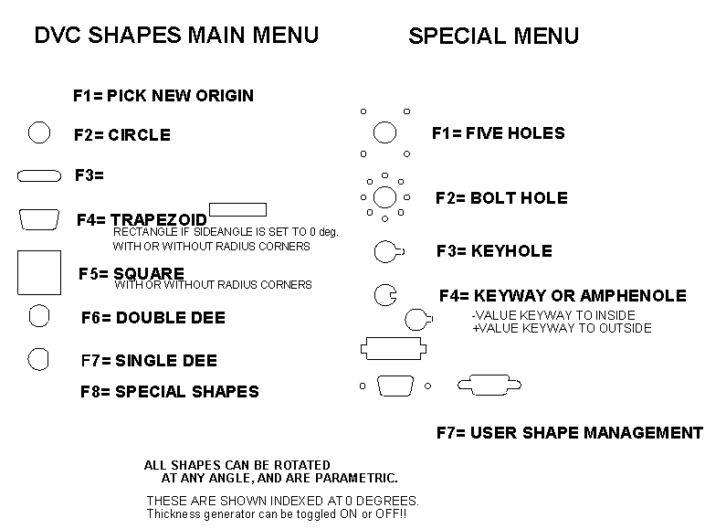 F4 OTHER More Shapes (See page 4 for types) When you pick this one a graphic display is drawn on the screen showing you what types to pick from. Enter a number on keypad corresponding with a desired shape. Remember only one surface is drawn so watch out for material thickness. DIF_PAN can draw all these shapes.