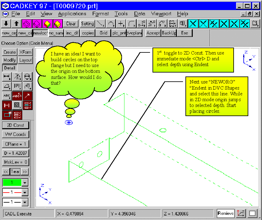 DVC.CDX (The main program) For Cadkey 97 1.02 you can use the Macro Manager and you can still use any immediate mode. (i.e. change color, level, etc.) For Cadkey 97 ver. 1.0 the best way to run this program is thru the Menu selection Applications,CADL Execute, Then Pick DVC.CDX.
