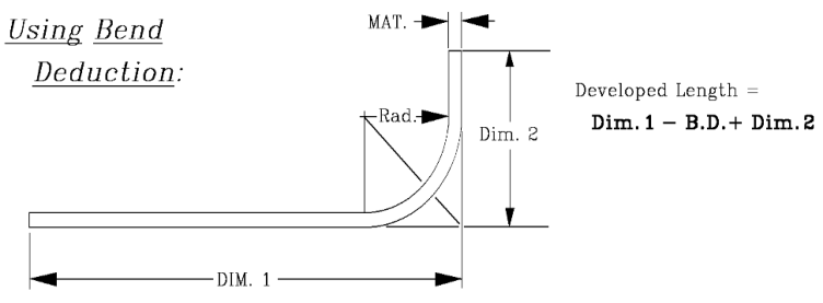 BEND DEDUCTION:Bend Deduction is the difference from the start of the radius to the apex of the angle times two minus the bend allowance. To state it simply:Bend deduction = D + D - bend allowance D = tan(A°÷ 2) x (MT + BR)Note! The formulas can be entered in the calculator (optionally purchased) exactly how they are written down. Remember mathematical hierarchy?