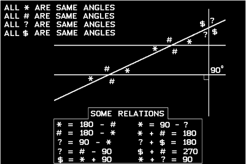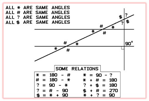 The two horizontal line segments are parallel to each other and perpendicular to the vertical line segment. For this illustration the # angle should not be less than 90 degrees and the * angle should not be greater than 90 degrees although most of the relations will still be true even if they are. For example * + # is still equal to 180 degrees no matter if * is greater or lesser than 90. Same for ? + $.Pay real close attention to this lesson.These angles are very important because the angle you may need is not the angle that the engineer may have given you on the blueprint.