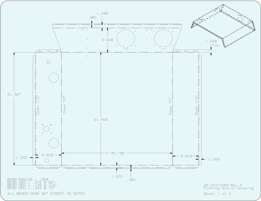 Customer provides STEP models exported from PRO-ECustomer also provides Engineering DrawingsDVC Cleans up Step models and Prepares for UnfoldingDVC Unfolds Models and creates FLAT DXF FilesDVC Creates Shop Drawings for floorDVC Also Creates Flat drawing used for their inspection Dept.DVC Creates FMS program for their Amada Turret PressesDVC provides via email Shop Drawings in PDF format, Flat DXF files, and CNC program files, G-code and the Native CAM files for AP100US/FabriWin